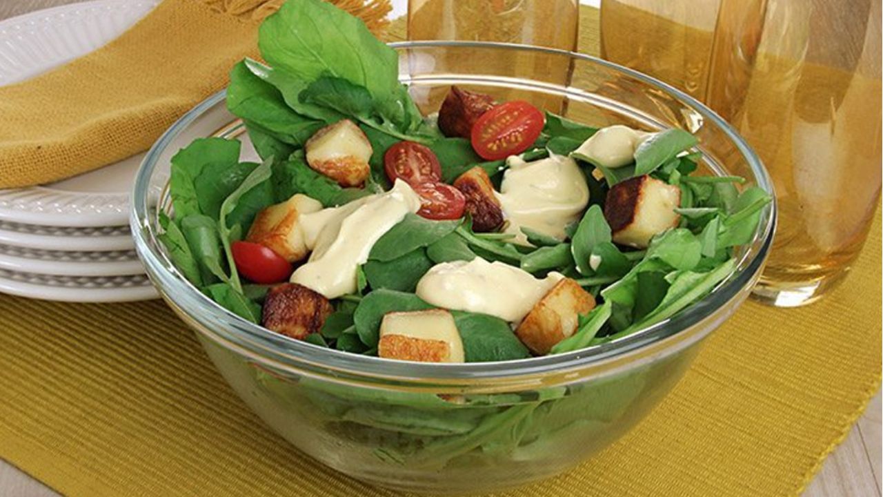 Em um prato de servir, disponha a rúcula, as alfaces, o tomate, os croutons e as fatias de queijo. Regue com o molho e sirva em seguida.
